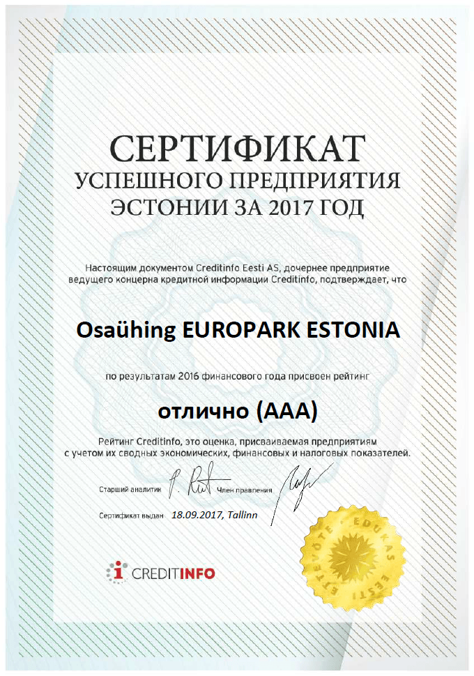 За последние годы EuroPark Estonia OÜ достигло кредитного рейтинга ААА, что демонстрирует хорошее экономическое положение предприятия, отличные финансовые результаты и корректное платежное поведение. Рейтинг Creditinfo разработан на основании международных моделей и акцептируется также за пределами Эстонии.