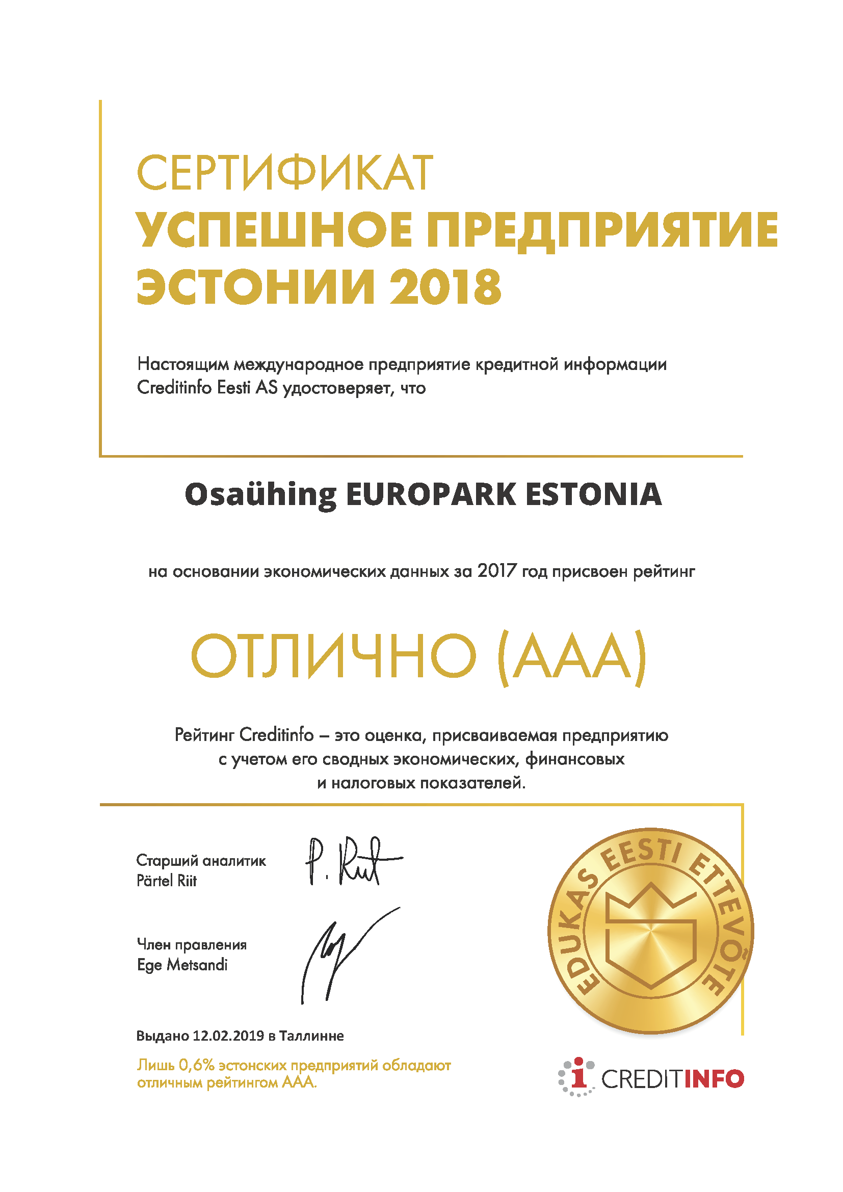 ДЕЙСТВУЮЩИЙ КРЕДИТНЫЙ РЕЙТИНГ, присвоенный компанией Creditinfo предприятию EuroPark Estonia OÜ - AAA (Отлично). В Эстонии кредитного рейтинга «отлично» удостоены всего 0,6% предприятий.
