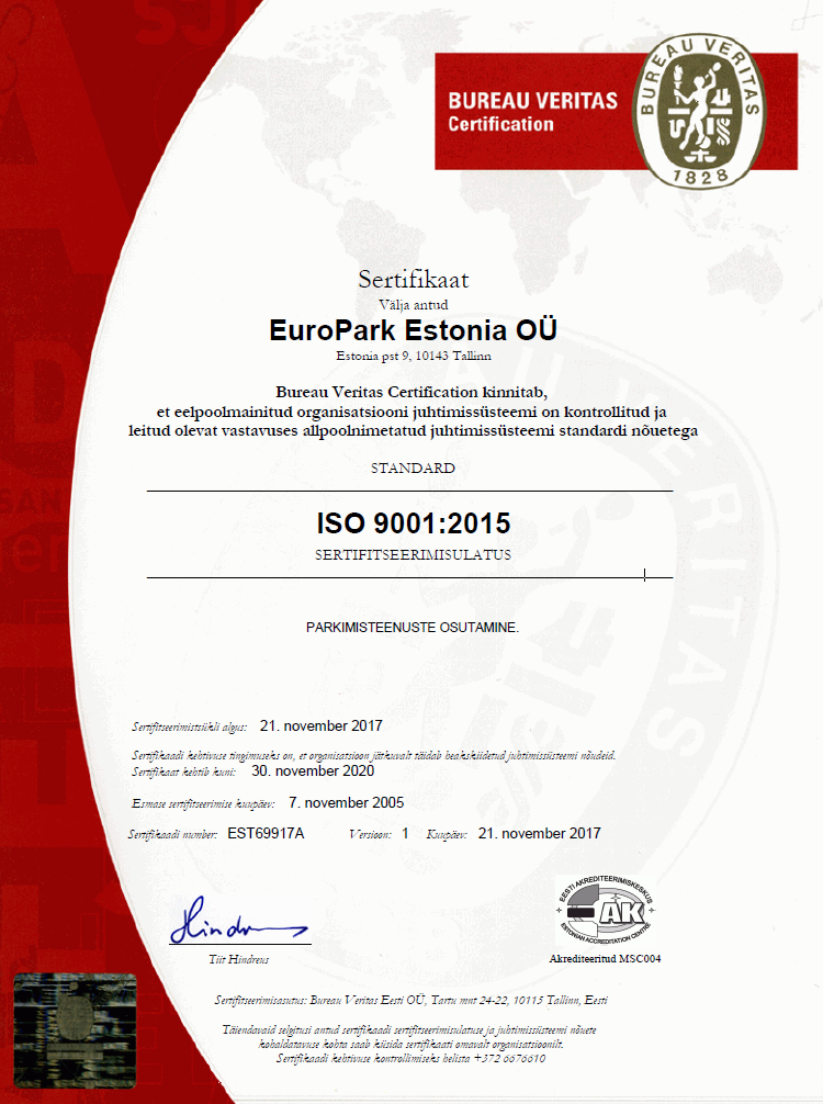Tõendiga kinnitab Bureau Veritas Eesti OÜ, et EuroPark Estonia OÜ organisatsiooni juhtimissüsteemi on kontrollitud ja leitud olevat vastavuses ISO 9001:2015 juhtimissüsteemi standardi nõuetega. ISO sertifikaadi uuendamise eesmärgiks on ettevõtte tegevuse tõhustamine, konkurentsivõime suurendamine ning klientide ja töötajate jätkuv rahulolu tõstmine.